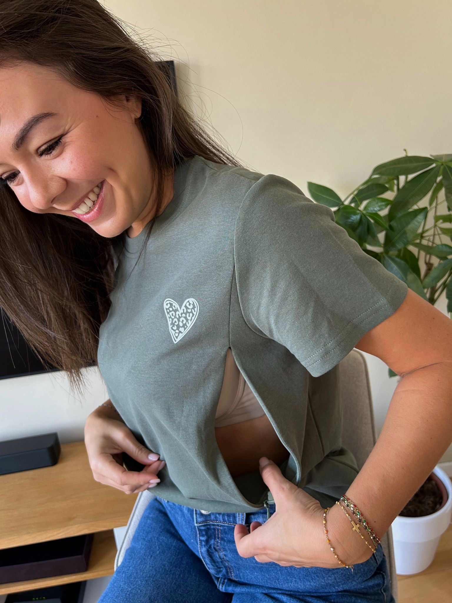 Le t-shirt d’allaitement Alma, en khaki moderne et col rond, associe simplicité et caractère, pour un style facile à porter au quotidien.