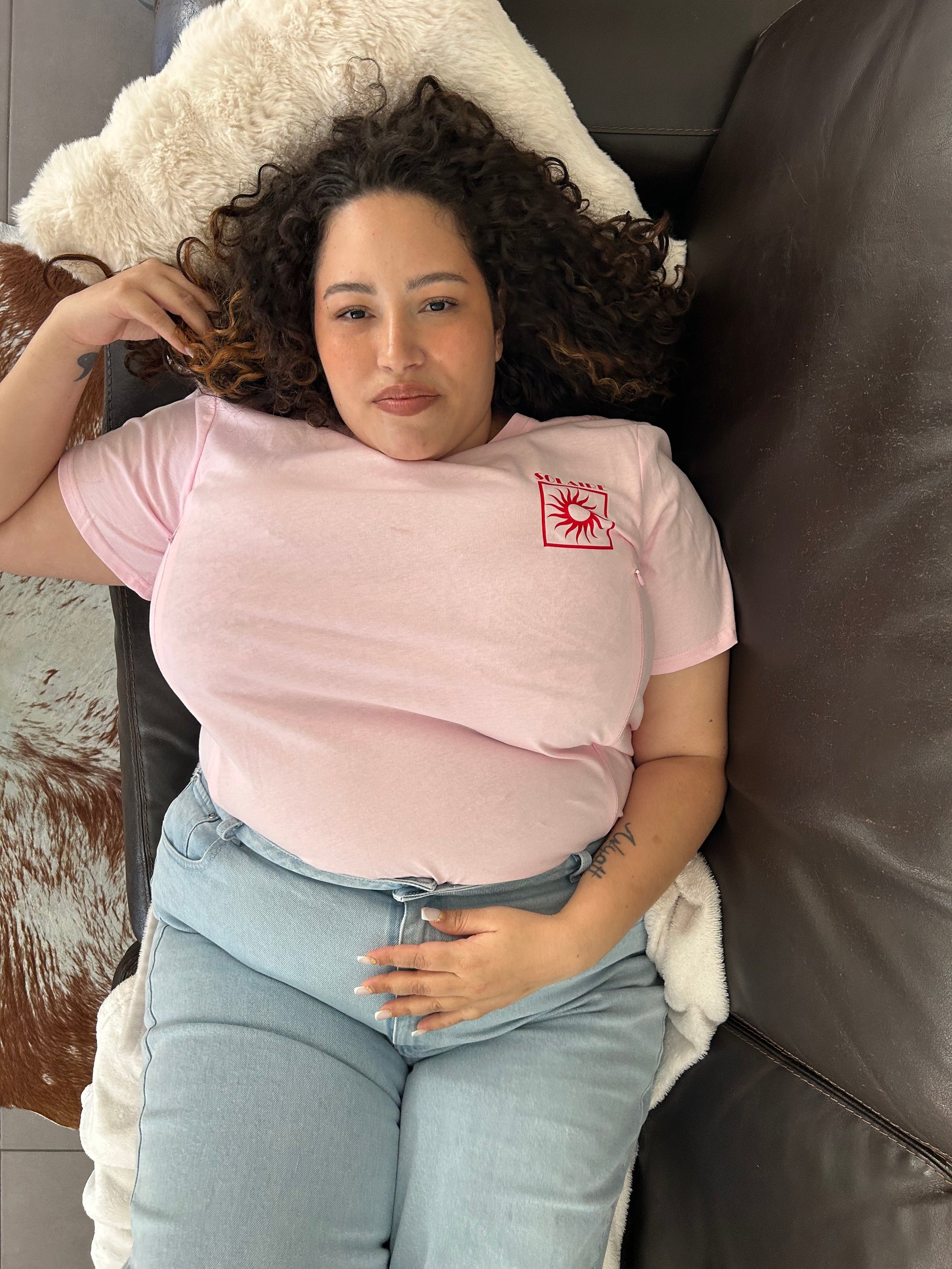 Sur la poitrine, son logo « Solaire » au style raffiné diffuse une note de chaleur et de tendresse ☀, comme un petit rappel quotidien de la beauté de la maternité.