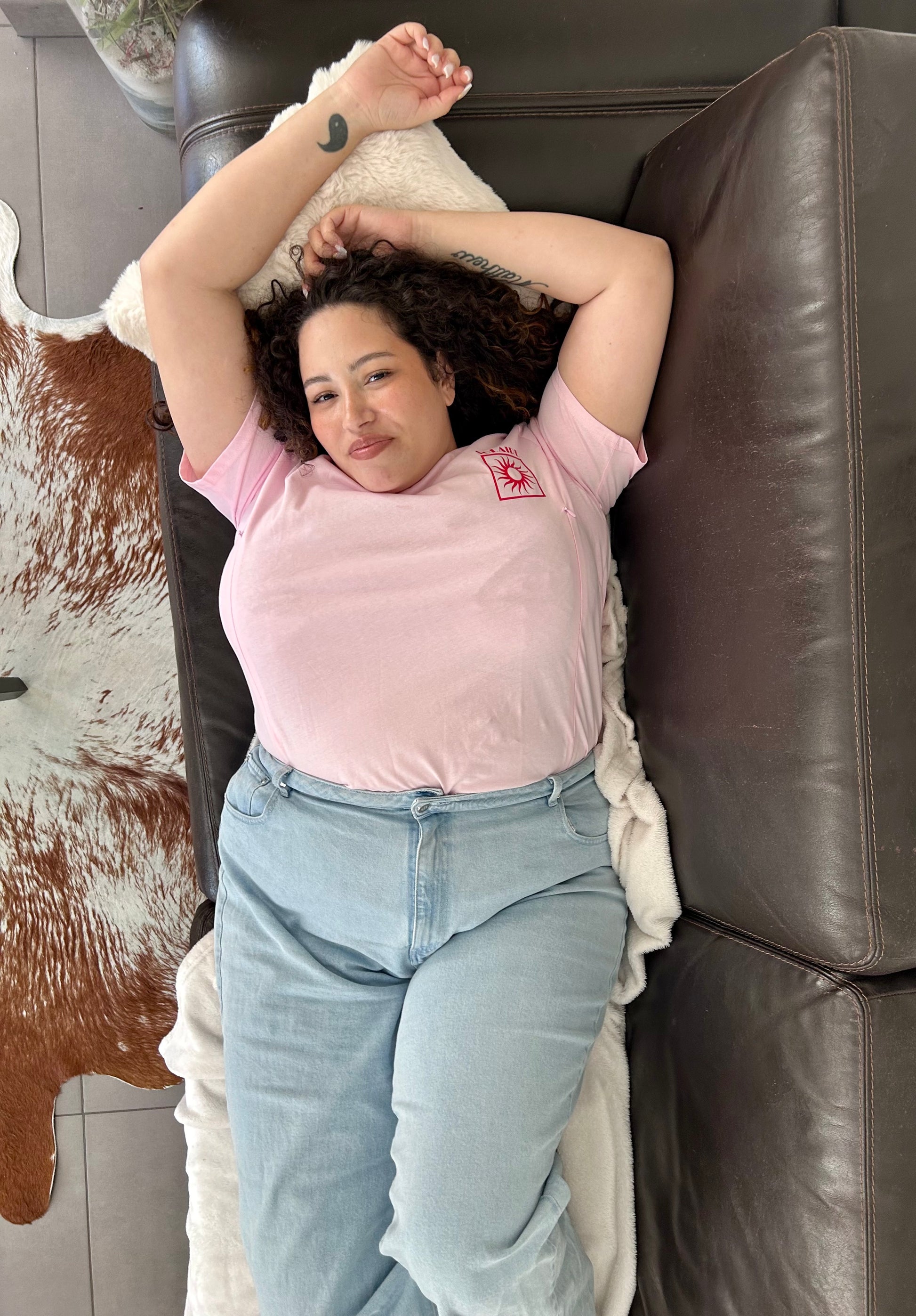 L'allaitement peut être lumineux comme un rayon de soleil et doux comme une caresse… C'est tout l'esprit du t-shirt d'allaitement Olympe , en rose pâle délicate et col rond.