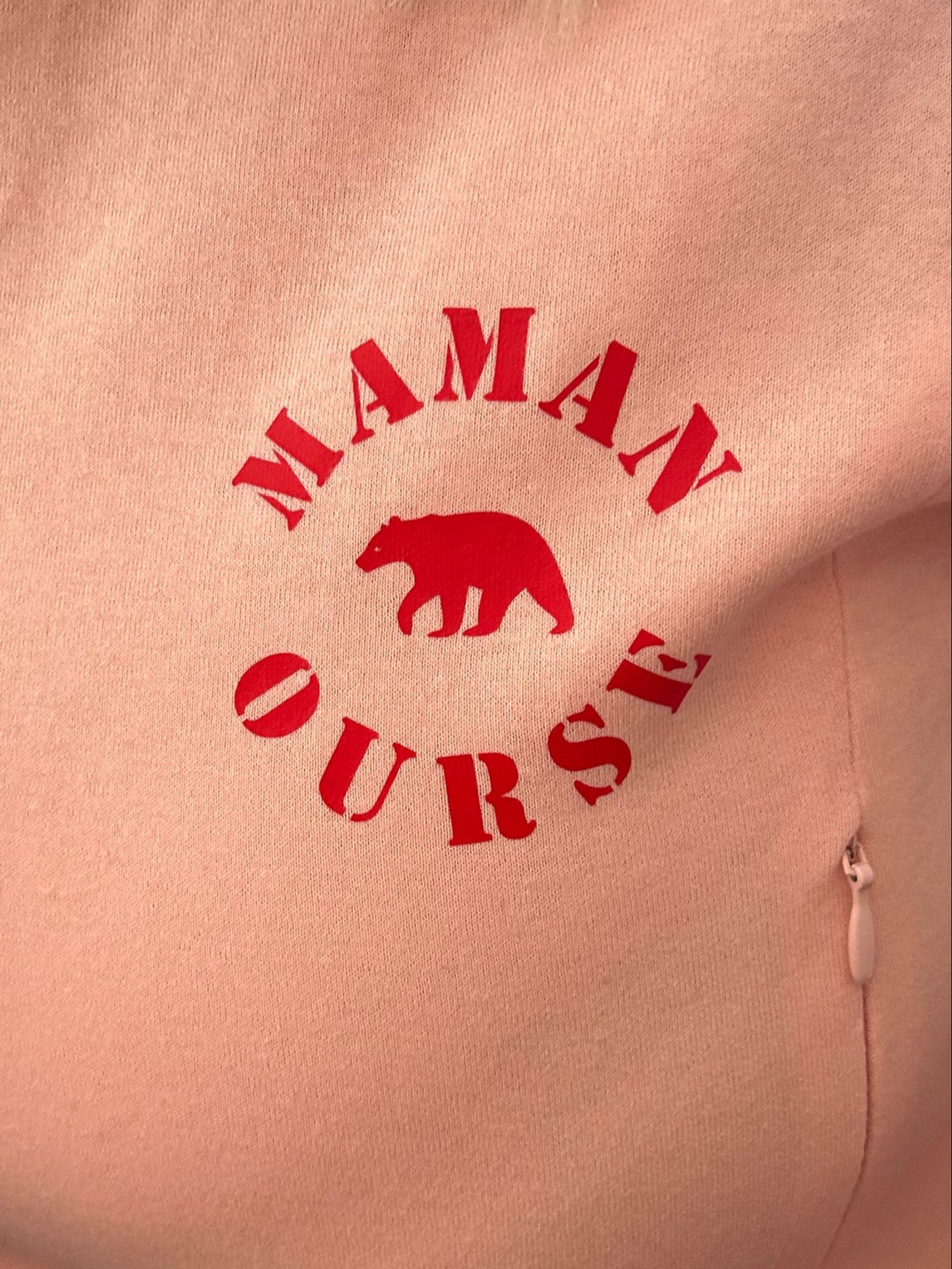 Sur la poitrine, son petit logo « Maman Ourse », inspiré des montagnes, mis en scène un ours au centre accompagné d'une écriture délicatement rustique 🐻. Un symbole protecteur et affectueux, pensé comme un clin d'œil à la force et à la tendresse maternelle.